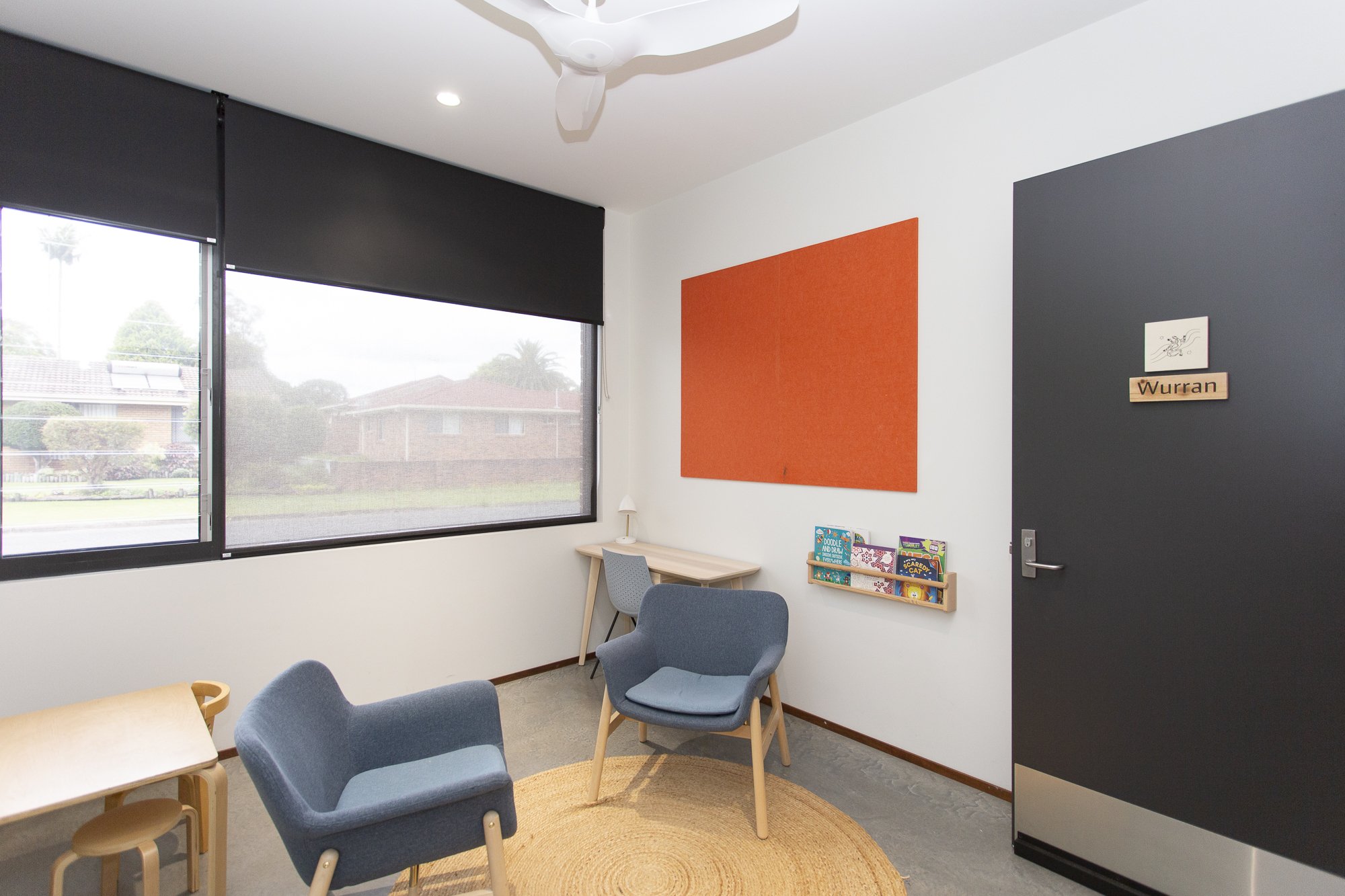 Goanna (Wurran) Room offers a warm inviting space for individual therapy / assessment sessions, counselling or consults. It also provides an informal space for meetings for 4 people.